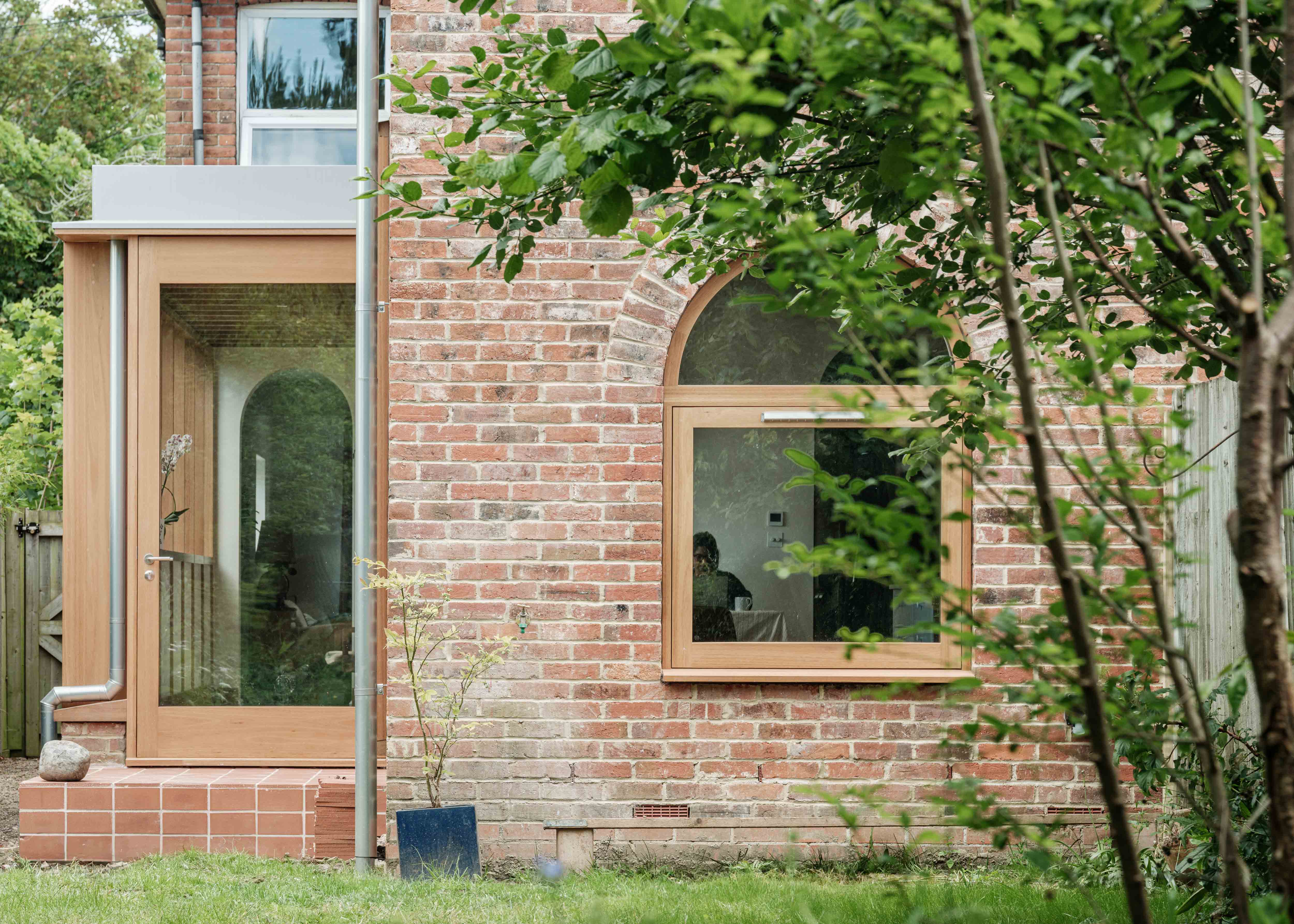 At No. 5, a full wraparound extension was introduced, characterised by considered brick bonding and timeless Crittall-style openings. In contrast, No. 6 adopts a more contemporary expression: a timber-framed extension articulated with expansive fixed glazing and eco-conscious red Viroc cladding panels. Working alongside CAB Workshop, bespoke doors and windows were crafted in red grandis - a sustainably sourced timber.