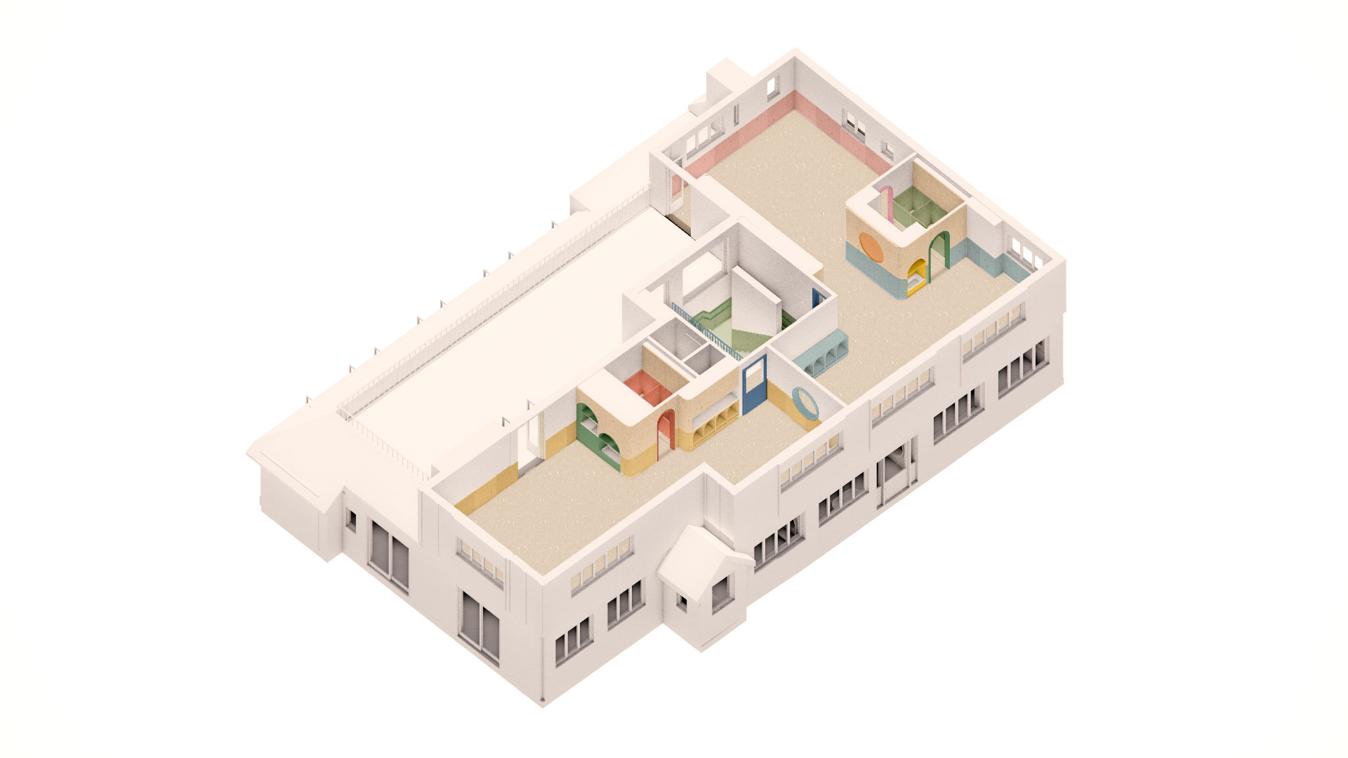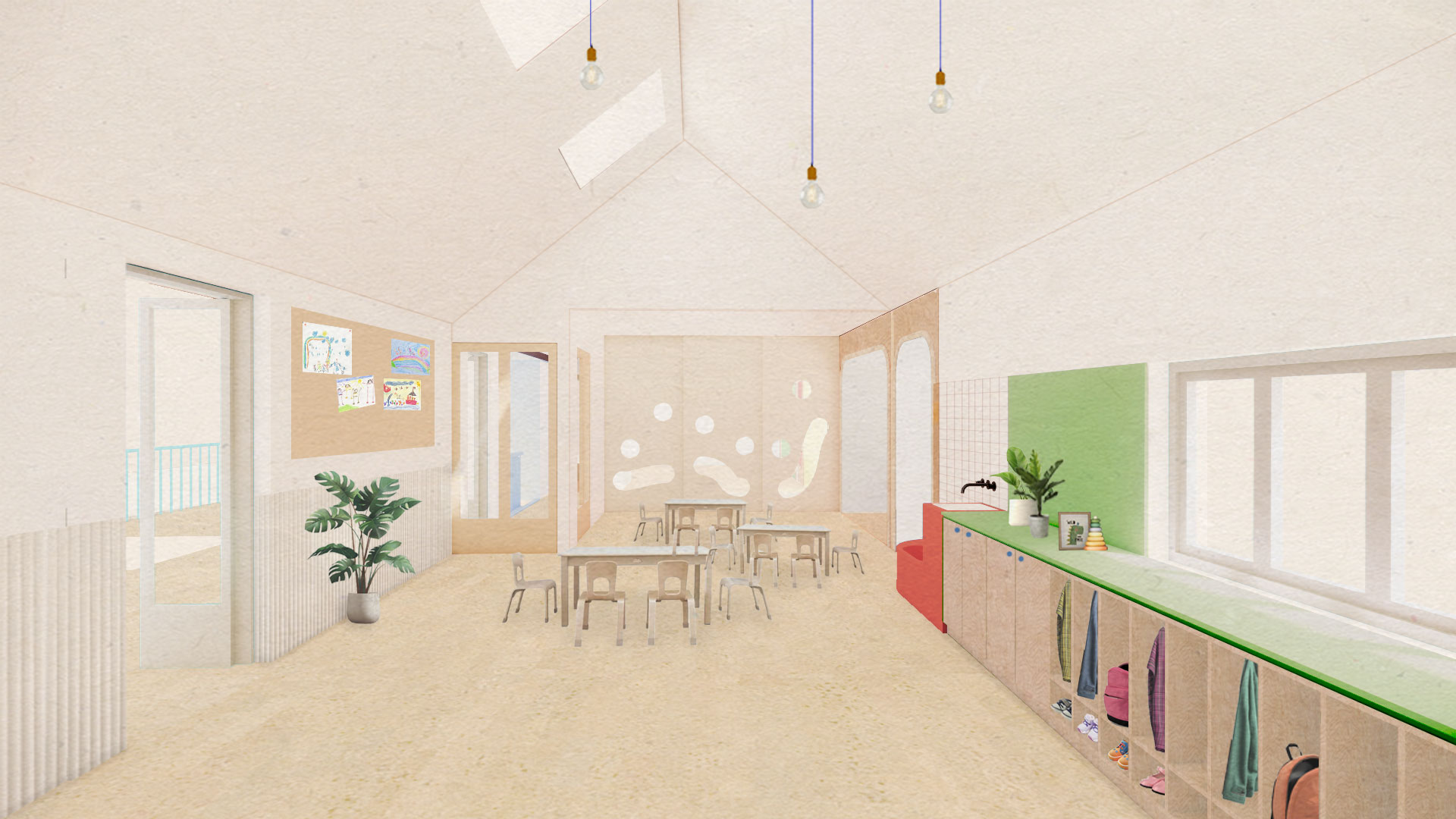 A local pub at risk of demolition, the building has been retained and reimagined to accommodate 90 children across generous, free-flowing spaces. The layout was purposefully arranged around each classroom having direct access to the outdoors across both levels.